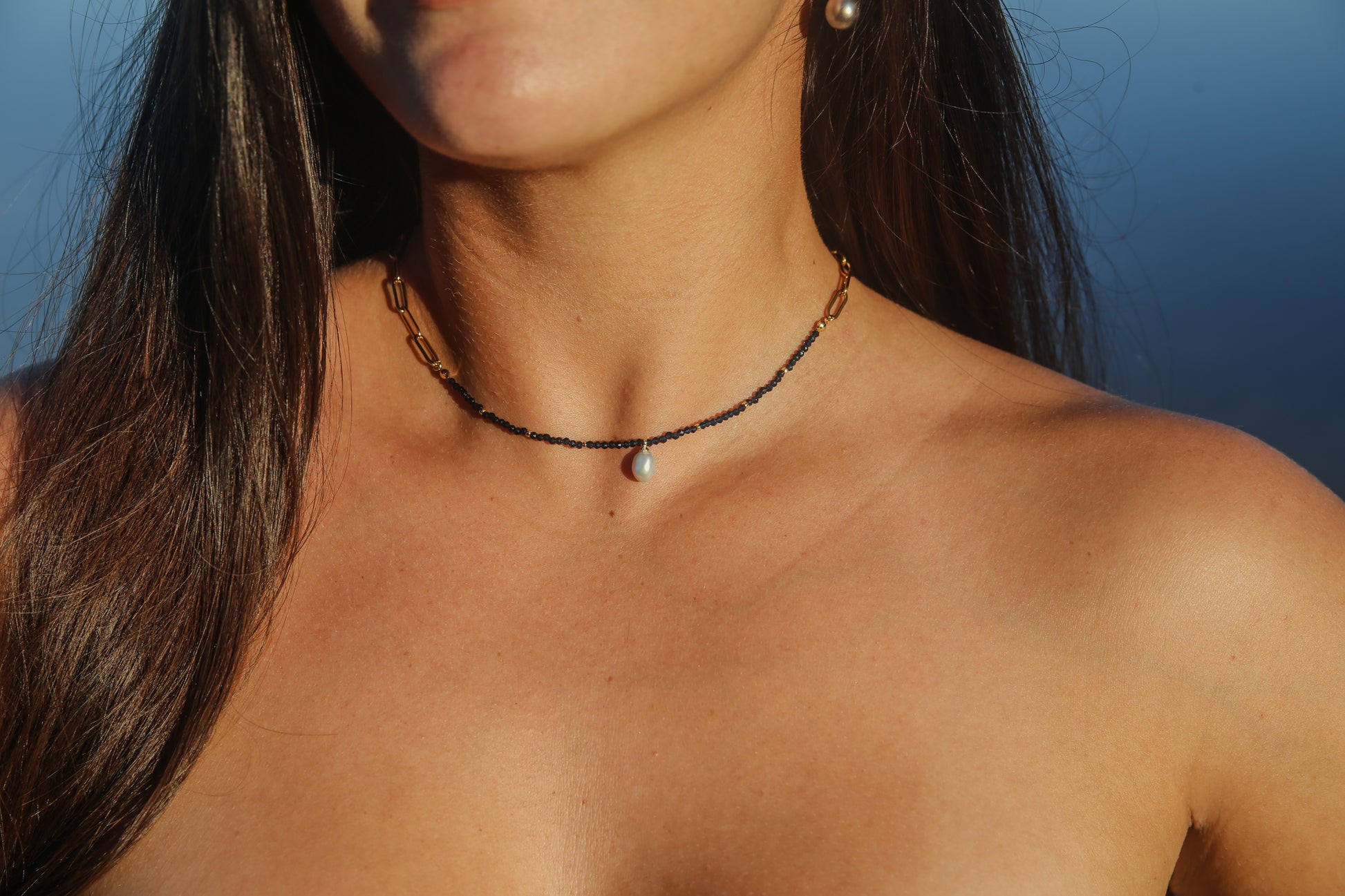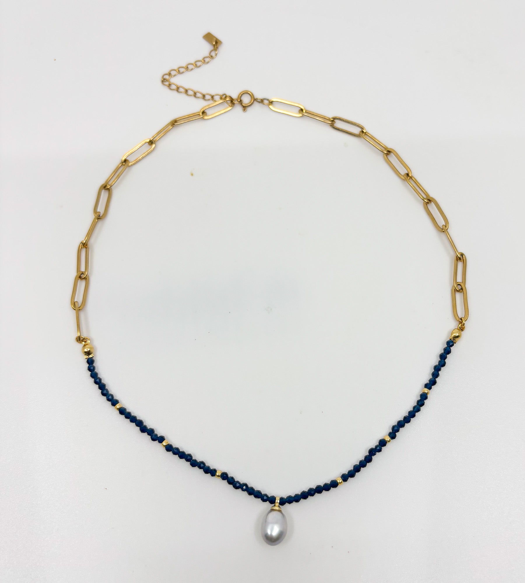 Harmonie entre énergie et calme. Un keshi central, des perles bleues et dorées montées à la main. Léger, équilibré, à porter chaque jour.